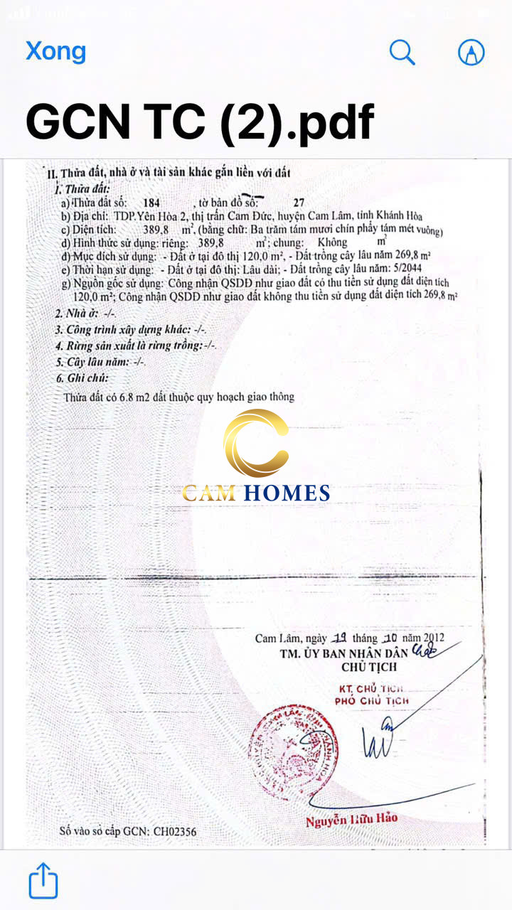 - Gía tốt nhất thị trường - Đất quy hoạch an toàn - Diện Tích 389.8m2 , ODT 120M2 - Cách trường tiểu học Cam Đức 1 : 160m - Cách QL1A 400m